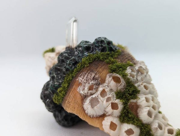 Using the artistry of polymer clay, I sculpted a lifelike sea-themed growth, which gracefully weaves and winds throughout the shell's elegant curves. Each meticulous detail evokes the secrets of the deep, as if the shell has become a vessel for nature's own enchantment.