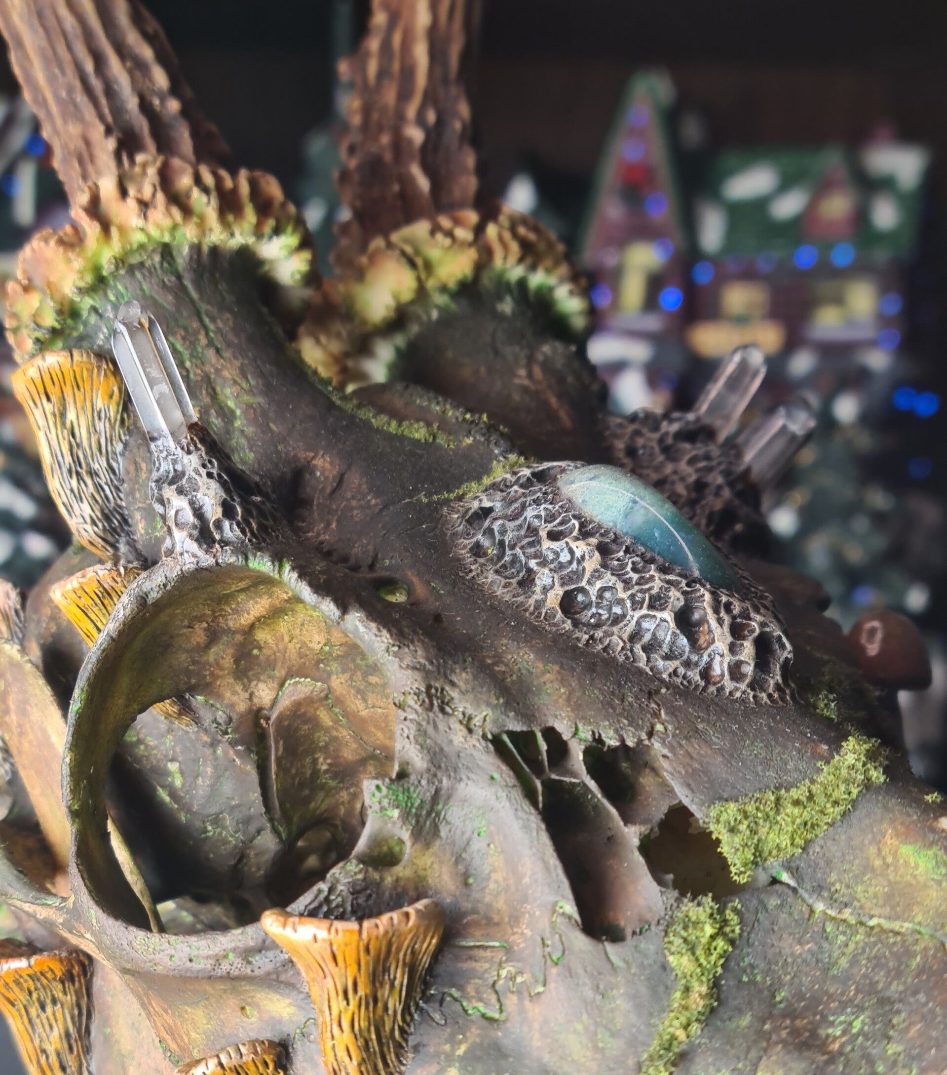 The ingenuity of this design is elevated through the addition of hand-sculpted shelf mushrooms and fungi, carefully crafted using polymer clays and adorned with artificial moss.
