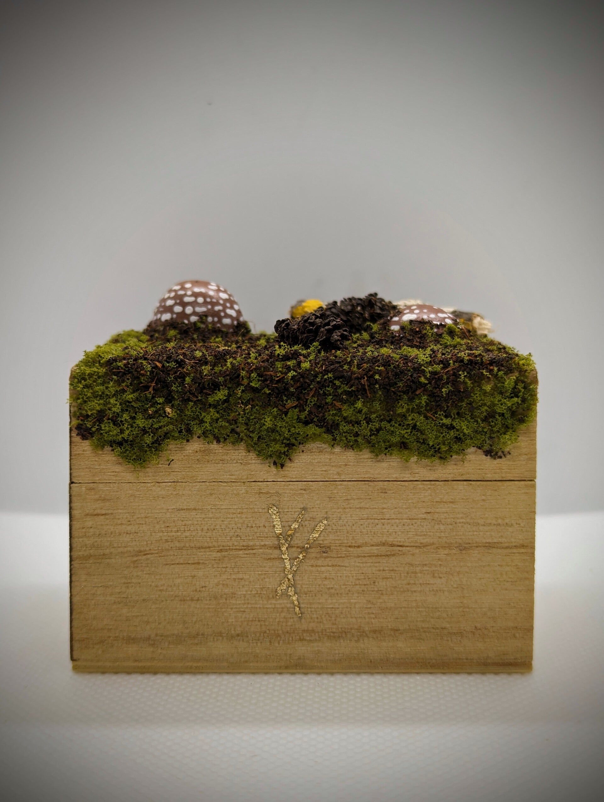 Adorned with Gandalf's golden rune hand-gilded using 24kt gold leaf and a scene of hand-sculpted Amanita mushrooms amidst Welsh forest finds, makes it a magical portal to fantasy.