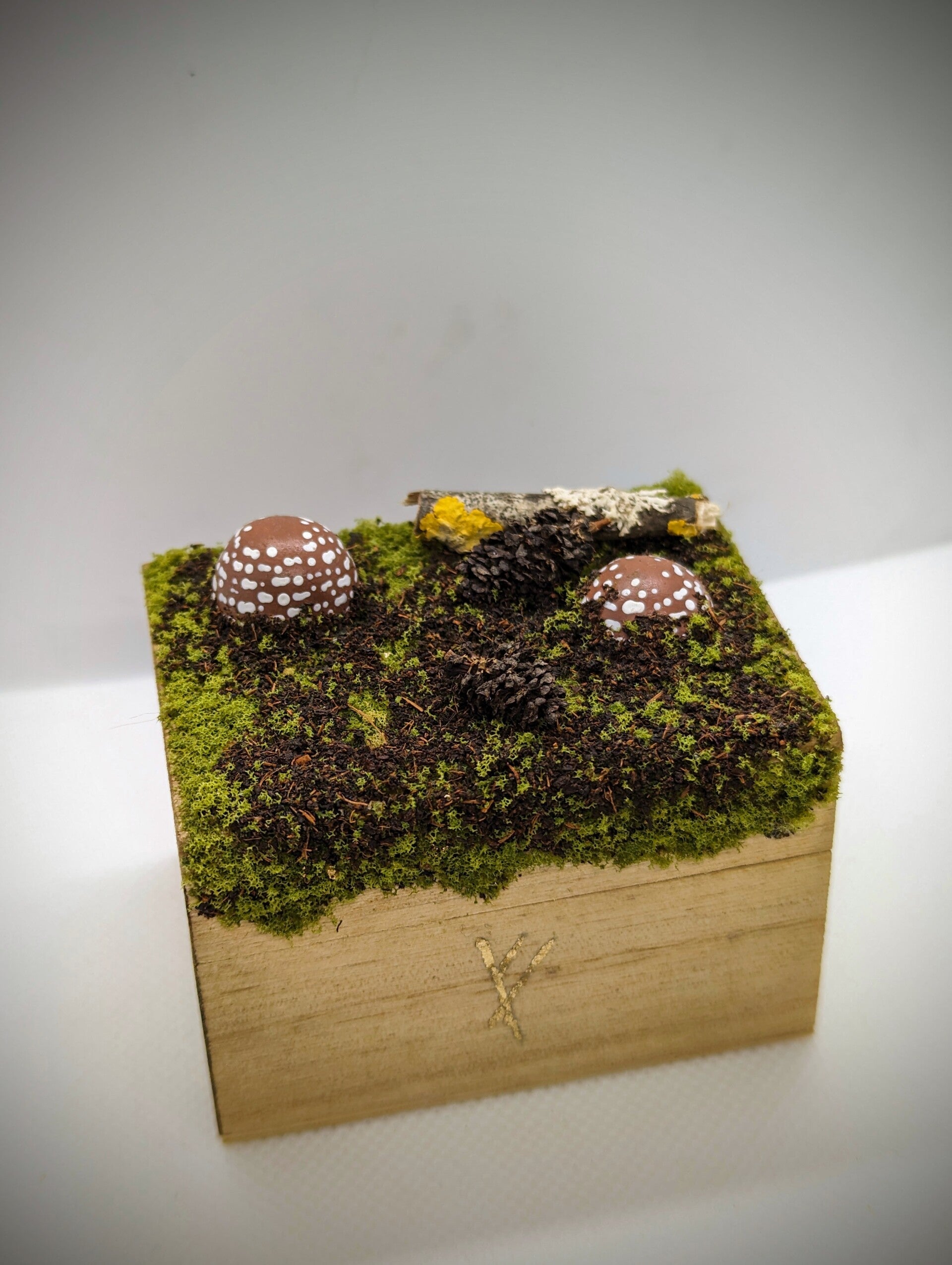 - The cute Amanita tops you see poking out of the foliage/soil took me roughly 2/3 hours to sculpt and paint. Each mushroom has 4 layers of beige paint, watered down so it is almost streak free. The cute white speckles takes plenty of time and patience.
