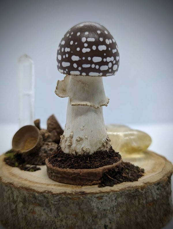 - Once my replicated Amanita mushroom is complete, I carefully secure the sculpture to this wonderful live edge slice of Elm, using Epoxy glue and adding my artificial soil/moss mixture. I have added a couple of acorn tops and a Quartz crystal to draw energy to charge your favourite crystals, as I felt this complimented the design and gave it a whimsical finish. This takes 2 hours, because I build up the layers to replicate the forests floors natural form.