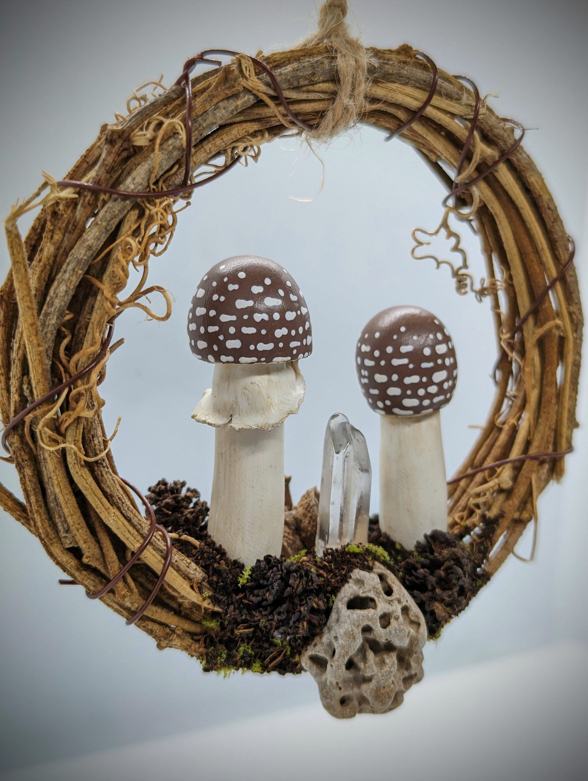 - Each Amanita mushroom has been delicately sculpted using Fimo polymer clay and takes roughly 3 1/2 hours to create these mushrooms. I like to sculpt their bases around some aluminium wire so that I can secure them to each wreath once complete.